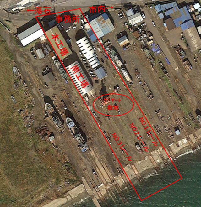 2020年7月 2011年5月に気仙沼から根室に本社機能を移転。 第一拠店としてすぐに支店登記し9年が経ちました。 6年間最後まで残ってくれた気仙沼社員3人(現在は全員 (株)みらい造船の本社員に)の踏ん張りの証しが今のこの 根室社員100%になった花咲港工場なんです。 みらい造船 とのコラボ も現在既に開始してます。 神の導きですから、 誰かが引く道じゃない。 K-Yardのこの先も道筋通りです。 / ホーム / 花咲港工場 航空写真 (2016/11/25 ) 航空写真は未だ更新無し。
