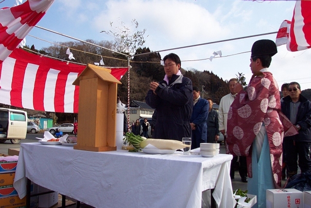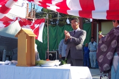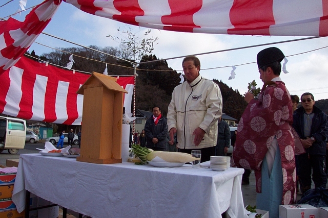 25日AM9:00から 2隻合同の進水式を執り行いました。 敷島機器稚内支店長(奥)、佐藤電機、