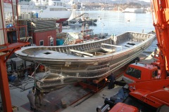 甲板のFRP敷板あわせやっています、 25日に進水。