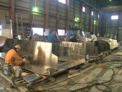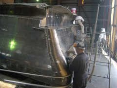 左:反転2/3回目。 その前の正立状態でブリッジ・甲板機器を乗せて08/31に船主様と打合せしました。 右:根室の25才"沼田"に、 この船の船首部を含む全ての歪取りを任せています。 3年生頑張っています。