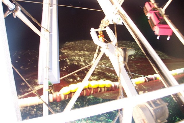 網入れのタイミングを計っているのか、 ソナーと船首での探索ライト・脇の海面を見つめ・・・