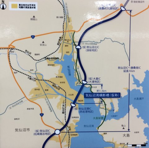 三陸道が湾を跨ぎます。すごい土木工事。瀬戸内並みになっていく。 赤い字で