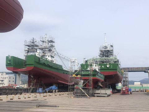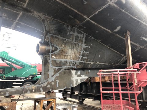 建造中の沖合底曳網105t 11宏伸丸の船尾船型