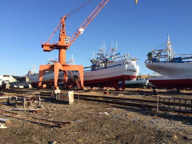 事務所から花咲港の海まで170mもある。 NO1レールには冬上架 の。定置船2隻(19t)、 NO2レールにはシーズン後に19tサンマ船 3隻が上架する。K-Yardになって本工場の海側に南工場 (32m x 15m ・天井クレーン無し) が2014年に建てて効率化 を図る。 2工場合せて全長62m、 "みらい造船 南工場"より長い。 NO1レール陸の食堂・倉庫を撤去すれば、 NO1レールと中央 のNO2レールだけで全長25m級で7-8隻滞船可能。 NO3レールは新造船下架軌道ですが4隻。 神に与えられた 地ですから、 感謝しここでやりぬかねばと頑張っています。。 花咲港工場 本工場