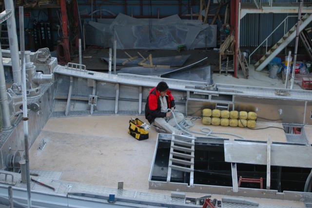進水の朝・・・船頭が係船ロープのさつま通しはじめた。