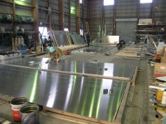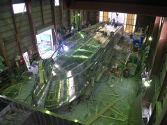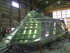 左:反転2/3回目。 その前の正立状態でブリッジ・甲板機器を乗せて08/31に船主様と打合せしました。 右:根室の25才"沼田"に、 この船の船首部を含む全ての歪取りを任せています。 3年生頑張っています。