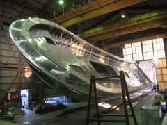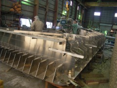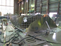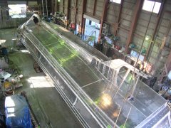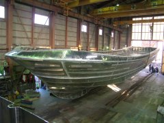 左:骨組み船尾から 右:ここから、 どんどん形に。 船首ブロック