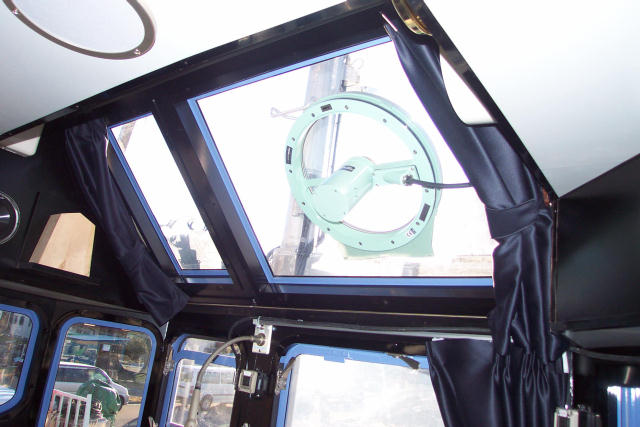 ブリッチ後ろ上部の窓、 ここでブームの先を見る、 高級暗カーテンが付く