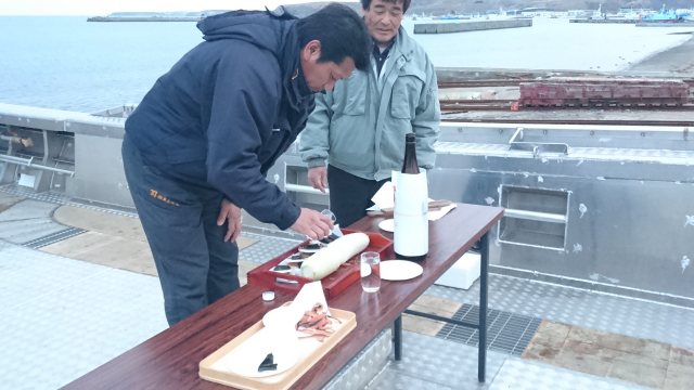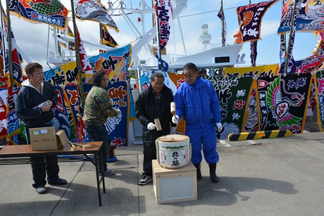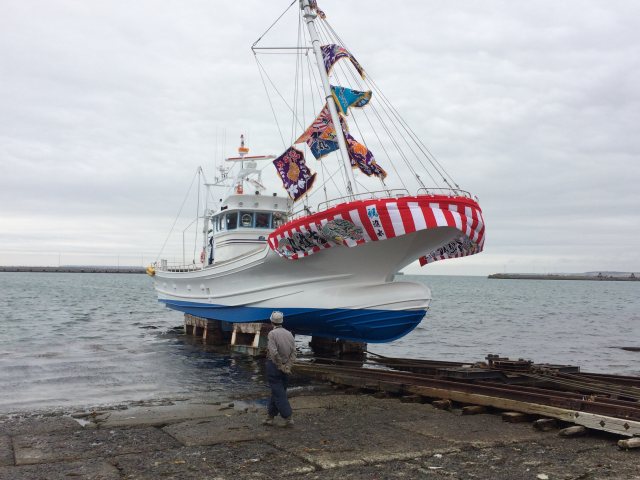 株式会社 ケーヤード 下の写真から順に上に来てください。 ![]() 船団の船頭仲間の皆さんと、 お疲れ様でした。 いろいろと指導いただき、 感謝申上げます。 K-Yardは新参者なのに、 本当におかげ様でした。 ![]() またもやベストショットや。 "空飛ぶ鏡餅" これって、 爺婆の頭に当たったら大変だべさねエ。 このショットは撮ろうとして撮りました。 フロックでない。 ![]() 餅まきの賑いの中、 ポッと、 小沼船主は遠まきから眺めようと・・ 一連の35吉進丸建造写真の中でベストショットです。 小沼さんお疲れ様でした。 次はお互い子供たちの代。 末永くご指導ください。 いい仕事させていただきました。 こういうの私、 見逃さないのです。 船主に気づかれずにそっと 後から回って・・ かっこいいと思う、 哀愁漂います。 疲れたべ。 新造船は一大事業ですもの。 本当にお疲れ様です、 もう少しです。 ![]() ブリッジ上の餅まきの若い衆は投げるのが下手なようで・・ この光景は造船の慣習ですから。 いいね・・ 祝い・威勢・賑い、 歓声、 祝福される瞬間。 穏やかで心豊かな日本人、 心から和む。 それにしてもものすごい人の数、小沼さんの人柄なんでしょ。200人? ![]() 鏡開き。 なんだかね。 木の味のする酒・・ いいね・・ 樽味 旨。 家らの社員も少しだけ? 集団間接Kiss。 皆同じ病気ですから。 根室の地酒"北の勝"ですね。 1週間に1晩は飲みたい酒です。 酒蔵のお母さん社長様には、節目には必ず「頑張ってますね。」 って励まして頂いています。 男前(男役)な感じで凛とした感じの 社長様です。 こんなとこで、 思いだしたようにの感謝は止せ。 ![]() 2016/04/27 AM11:40 最高の日。空気でそう感じる。 綺麗な衣裳着せてもらった 家の娘。 小さい船だから、 なおさらかわいく見える。 ![]() 2016/04/27 AM11:40 午後からお披露目・鏡開き・餅まきがあります。 天気が良くてね。 おめでたい画像ですね。 それにしても、この満艦、 すごい旗の数 大型中部サンマ船より揚げてんじゃない? ![]() 2016/04/26 PM3:40 根室港で満艦にして、直ぐに温根沼に回航。 お披露目走行。 旗立てても速い船ってあんまり無いな。 よろめかないし。 時化に強そう、 沿岸船にしてはオーバークオリティーかな? ![]() 湾内は徐航なんですけど、 速っ。 減速比が大きく船速出ない 予定でしたけど。気に行って頂ける速力が出てよかった。 FO-3KL搭載。 旗を下げ、 FO-1KLなら楽に24ノット船です。 この船は沿岸漁船ですので、 前方の視界性が重視されるので 船尾スタンに固定フックがあります。 ゆえ、 K-Yard船では不本意な 走行トリムは少ない船です。 サイド波が出てますがバルバス の流氷防御の半丸棒とバルジで発生していますが、 省抵抗だ から船尾を上げつつ船速は出ています、 滑走する寸前かも。 なんかこの娘、 清楚感あるな、 家の姉さま達とは、 ちょっと・・ ![]() 2016/04/26 AM8:40 進水式執り行い、進水です。バケツで潮をかけてあげるのを 忘れて、 30分、 娘(船)にごねられましたが、 進水します。 ![]() 2016/04/25 PM6:00 全員帰してから、船主さんの息子さんと2人で 命名式と御霊入れ式を執り行いました。船名旗を眺め「この船の名は 第三十五 吉進丸とす。」とか言ってから、この謎めいた儀式。 本気に、 きっちり2人で神経集中し、 お願いできたと思います。 お願いの儀式を執り行ってから、 夜中に私一人で御霊を入れさせて 頂きました。 「キエ〜〜・・・」 あくまで素人(インチキではない)祈祷師ですから。 |