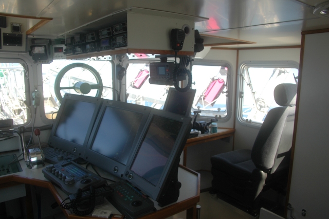 左舷(サンマ漁側)コックピット、 たかがサンマと戦うのにこの装備・・・ 室内色で黒基調が