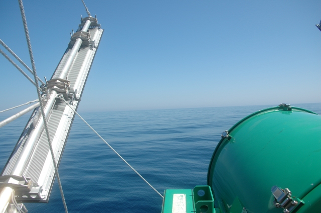 こんな凪でした。 5日の早朝 襟裳沖、 風が心地よくて・・・ (船首 キセノン投光機台から、
