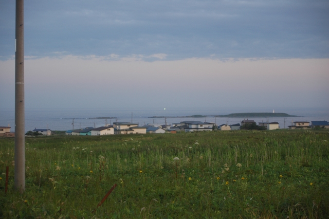 岸からはこんな色の光(青白い)に見える。 夏のノシャップの丘から (写真中央)