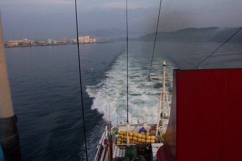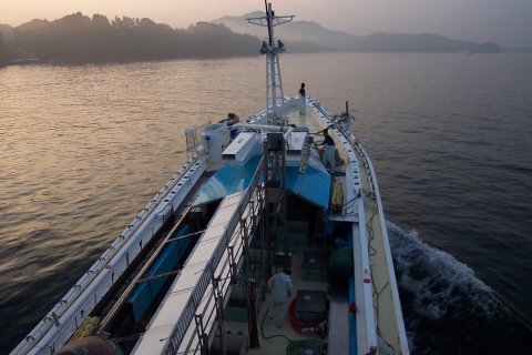 9日 AM5:00出港しました、 気仙沼湾北出口に向かう、 前は大島の亀山