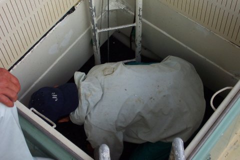 010:中央は活きイワシ昇降装置、 左舷の白いタンクにあがる