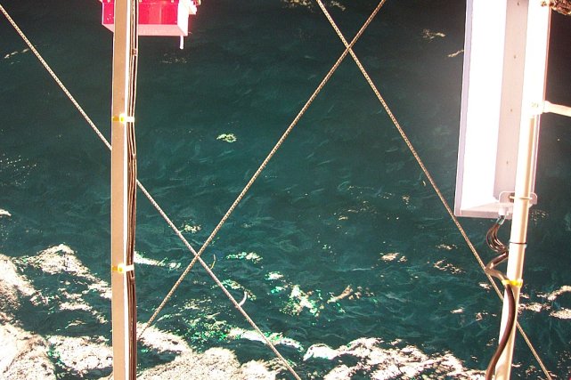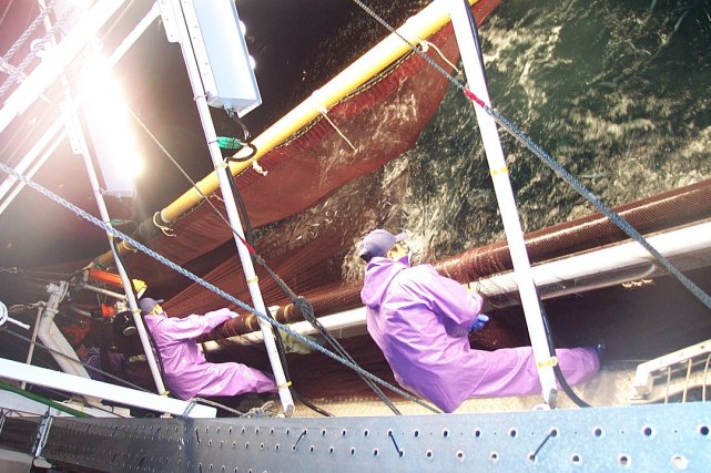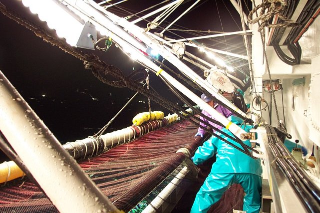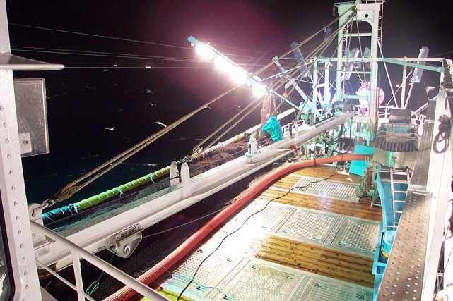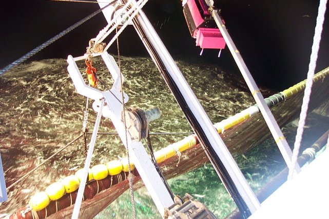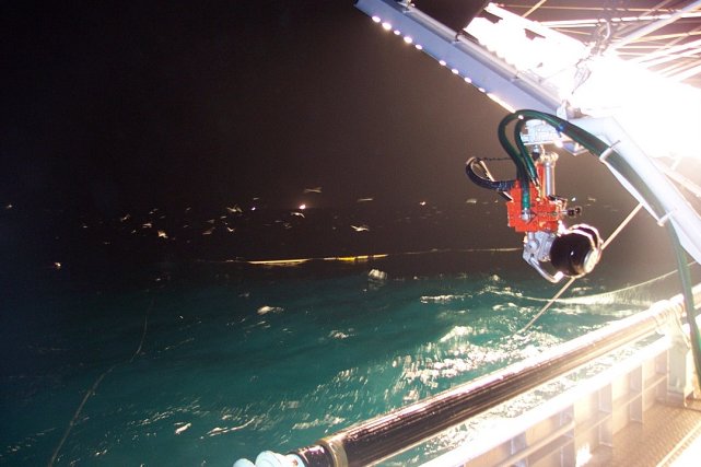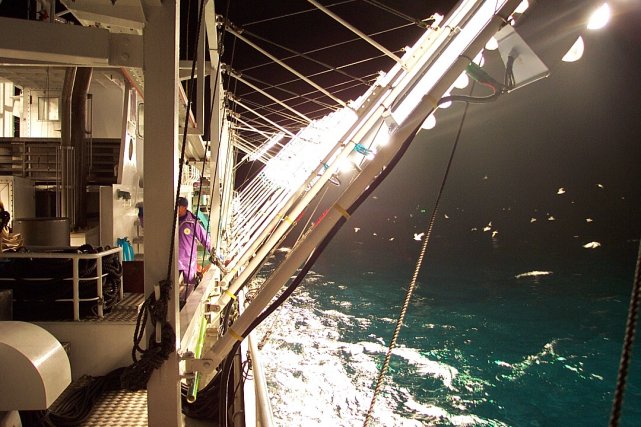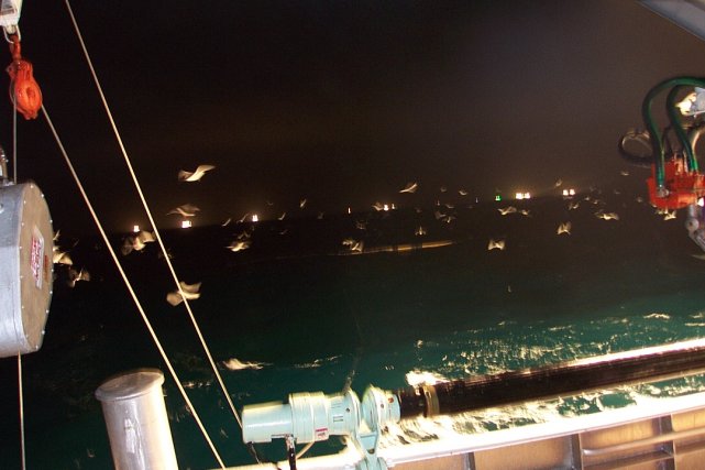 網入れのタイミングを計っているのか、 ソナーと船首での探索ライト・脇の海面を見つめ・・・