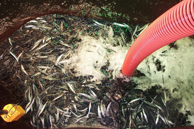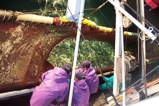 船首尾から網を巻き上げながら、 胴の間に絞り込む・・ノッコリ集まっています