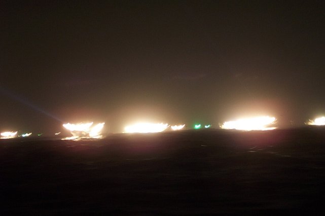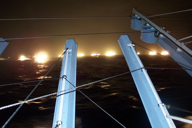アッパーブリッチ右舷より 船首を見る、 整然とスズラン(集魚灯)が並ぶ、 出港して