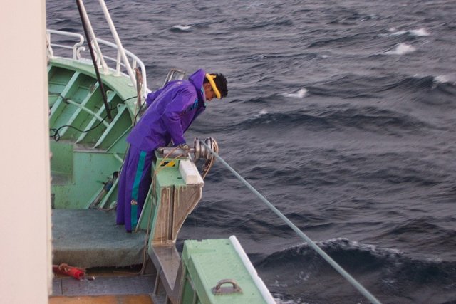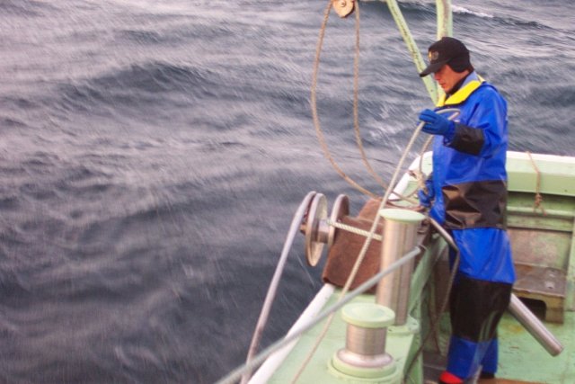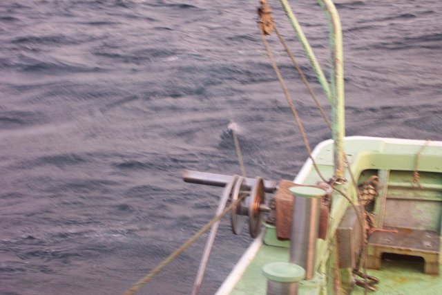 ロープはすごい張りでピンピン、 甲板長はエンジンリモコン