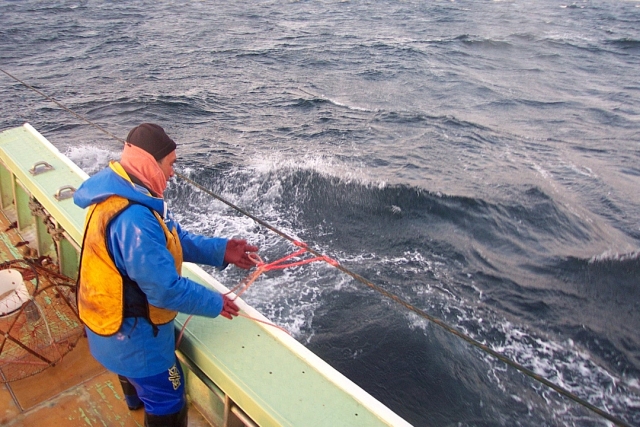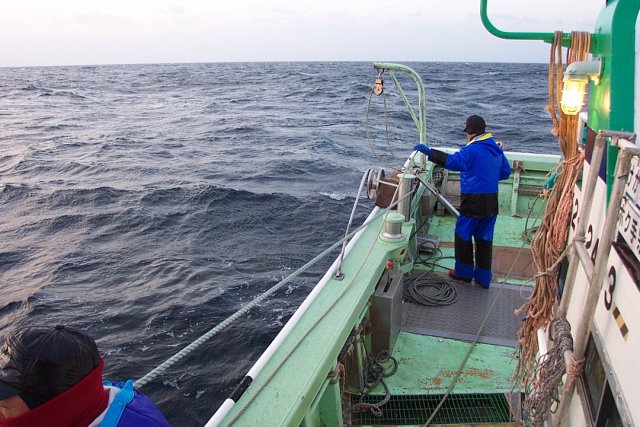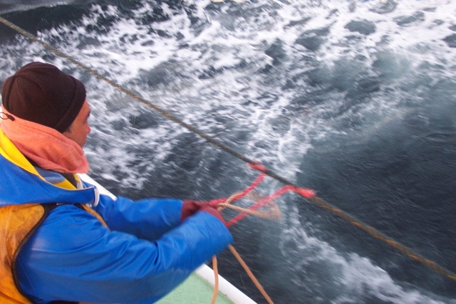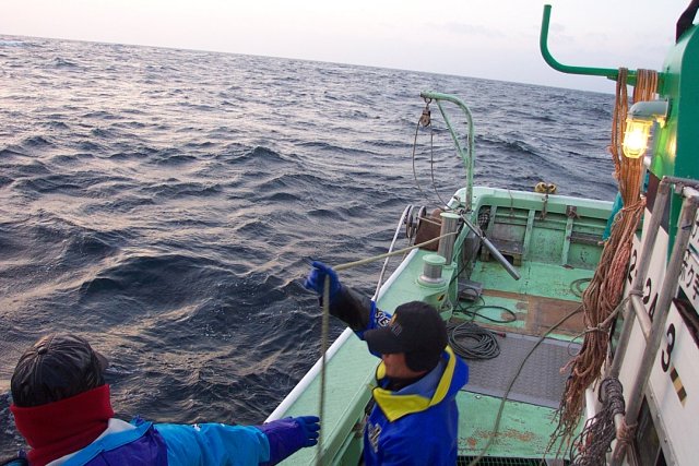 船頭はプロッターを見つめ あげる幹縄の先端の方向に針路を向けました。