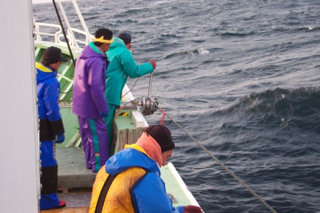この全景が一連の作業、 左舷端の餌入れの人が見えませんが・・