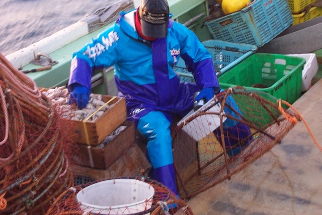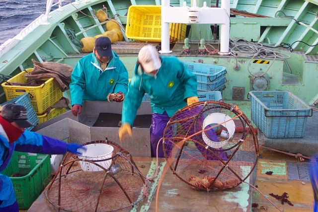 →入ったカニを選別台にアケル人→船頭がカニを選別→餌入れ→