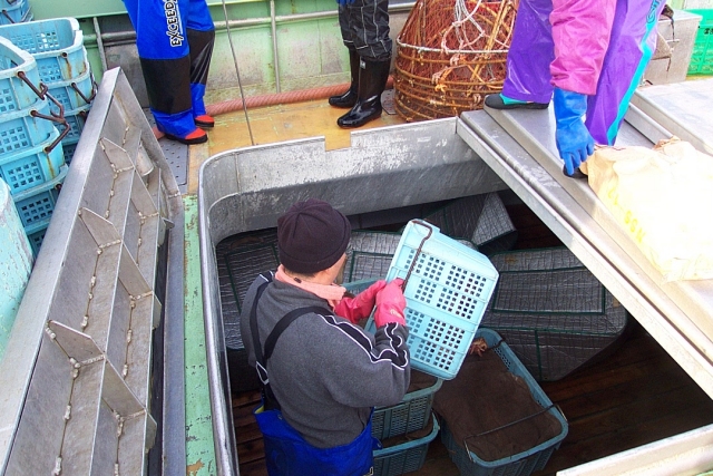 すぐ、 次の籠が・・・、 船頭がカニを選別、 身の軟いカニ(ワカ)と