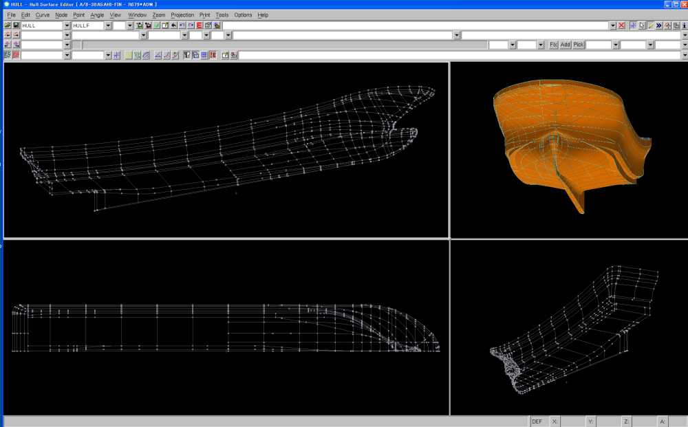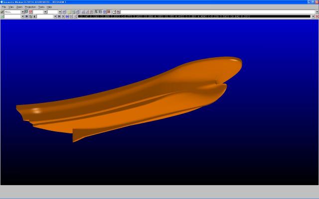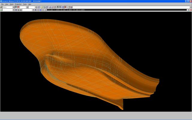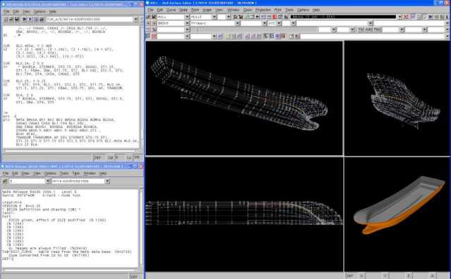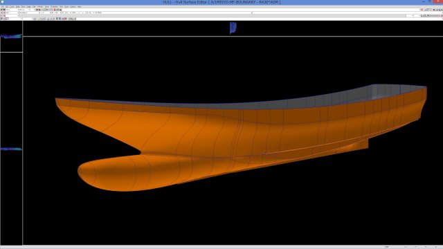 株式会社 ケーヤード 左上がTextEditer、 ここに座標とタグとプログラム言語でRunして蜘蛛の巣を 書くのだ。 左下がMainWindow、 プログラムEditerです、 あれこれと警告が出る。 右大がHull Surface Editer、 CADだと思えば悲しい、 確認・修正Editerです。 HSEで修正段階になるまでは、 ほとんど3Windowで仕事する。 今時じゃない気が プログラムとその言語に慣れるまで辛い。 こつを得るまで、 戸惑いの連続・・・。 苦しかったが、 曲面を語るには定義から入る手段も基本であり必須なのかも。 拡大あり ![]() HSEで楽しいフェアリング・面修正といきたいけど、 線の定義が悪いと 面もすったくれもない。それを乗り越え慣れてくれば、 いつもの スプライン制御点移動の2D-CAD現図の操作で進めれます。 やはり 大型船主体のプログラムなので小型漁船の複雑な曲面は苦手なのか、 結構ネットの目が細かくなり過ぎる(ライン・パッチ多い)ため、 細かな ムラ取りと自動のパッチ補助線の理解にやっぱり予想以上苦労した。 Surface精度は現場的には問題ないが、 精度を上げるにはやはり熟練 の技がいる。 Surfaceセンスが良くなるコマンドはありませんので・・。 *2010年 上記の下流設計に渡す3Dファイルの概念が変わり改善された。 バウンダリーカーブとかを決め、 最小面数でファイルを渡せるようになった。 マザーが出来たら、システムプログラムだからこんなことも! (Transformation できなきゃNAPAやる意味がない。) 下の図はNAPAで8あさひ丸を創成後、 幅で+8% 測度長さで+1.3% にしてTRAコマンド一発でボヨン、 超楽して完成したのが18幸隆丸。 部分割合定義しバルバスを焼き餅を引っ張ったように伸ばすことも。 船体の面(ハル)が完成したなら、 喫水線指示で容積等の ディメンションも瞬時。 タンク容積計算も。 そこで逆に容積や CBを変えて入力すれば船体線図がTransformationする。 これ だけでも初期設計の自信までの時間を大幅短縮できますよね。 ここらでやっと頑張った甲斐がでた。 こんな幸せ・・が現実に 拡大あり ![]() 細かな SurfaceのムラはKEYCREATORにIges Fileで 持ってきて検証し、 NAPAにフィードバックしたりなんかもする。 もっとNAPAの達人になって、 若い者に教え共有したい気がする。 習得期間はLINE屋以外の設計者でも。 自分が教えれば1・2ヶ月 とか、自分はもう、 このパートも早く卒業したいから言ってます。 NAPAオペ習得に後先はないです。設計のベテランから入る・ 若年者が遊びながら入るどちらでも有益には違いない。 けど、待ち構えているのは適正もあるが、 あくまで人の 作ったプログラム。特殊な慣れが必要、頭がすり減ります。 拡大あり