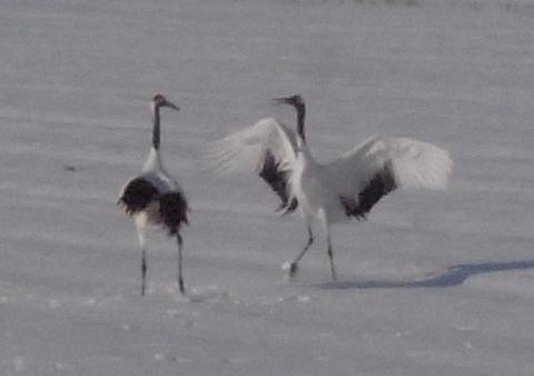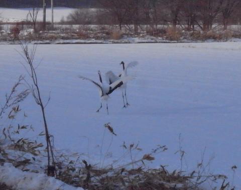 鶴居のちょっと手前で、 丹頂のつがいが求愛ダンスしている