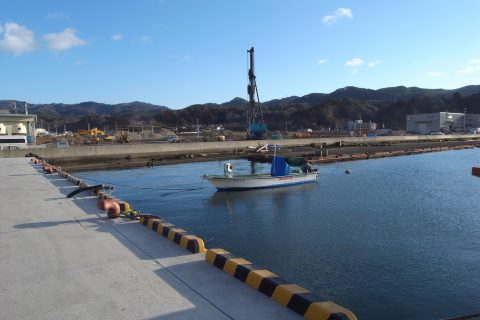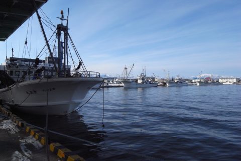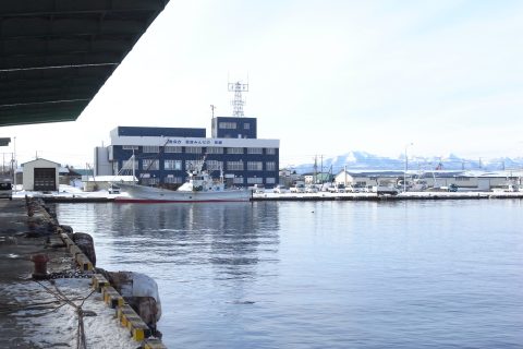 ホタテ船が着く岸壁と阿寒の山々。 組合前の船は柏崎造船