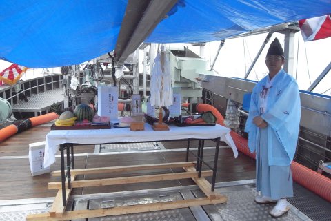 神主さん執り行い後、 AM10:20少し凪だので知来別に向けて出航。