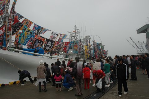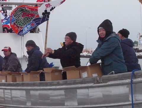 餅まき。 船主(親)さん乗組員さんお友達の大和さん。 後ろの