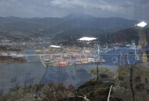 ”ここ”の場所に”みらい造船”ができます。気仙沼湾の中の大島山頂から