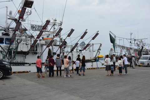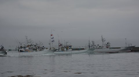 200トンの大型サンマ船が切り上げて、次々縦付けで係留。
