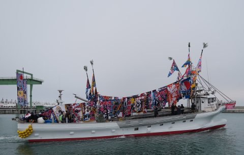 無事、 浜鬼に着き、 化粧旗をあげ、 いざ知来別に